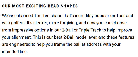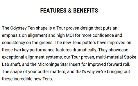 | LOOKS | Traditional looking putters featuring small heads | Modern looking putters featuring large heads |